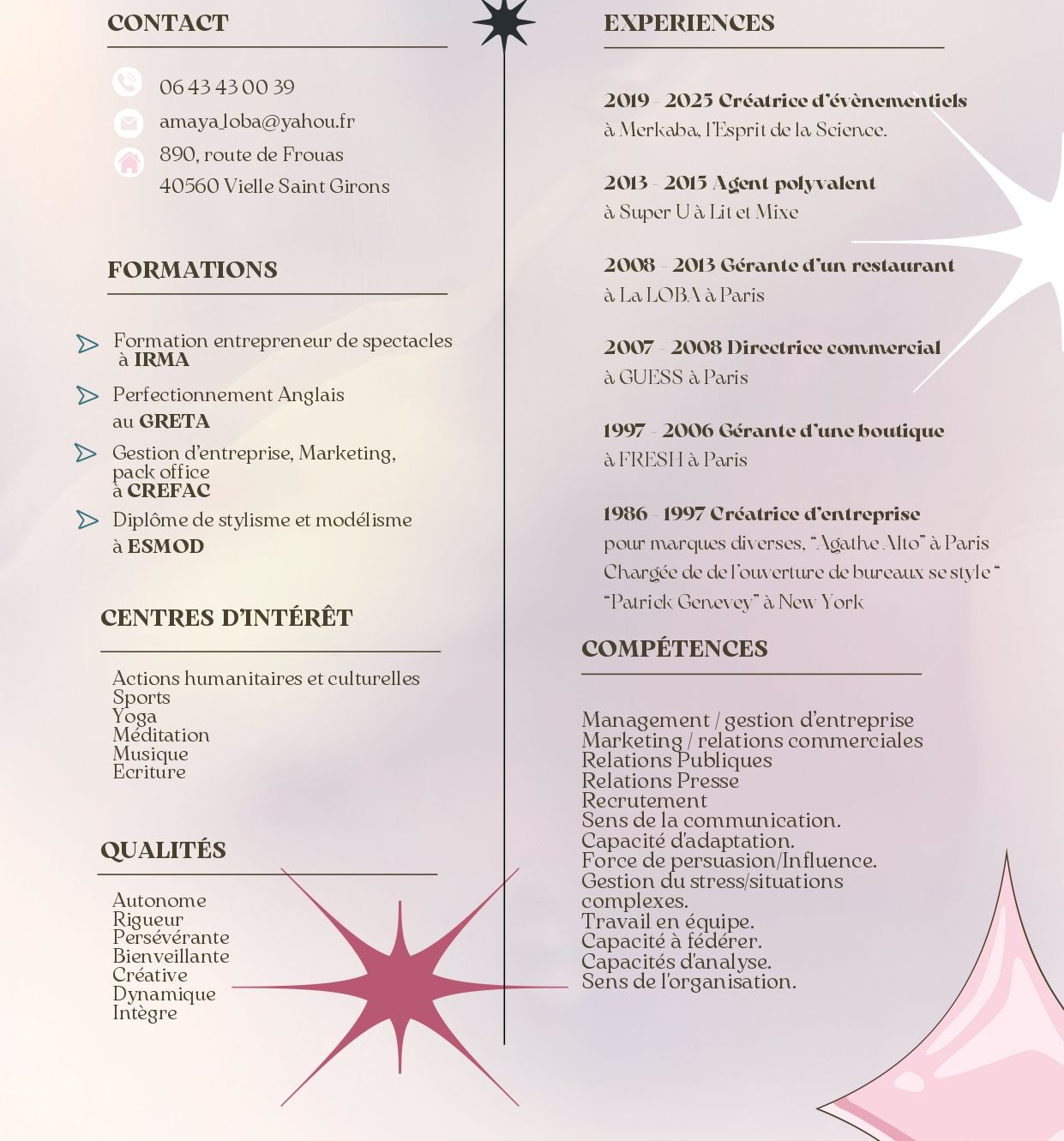 En parallèle, elle se lancera dans une carrière dans le domaine de la mode. De styliste, elle se dirigera vers un dernier poste de directrice commerciale pour une grande entreprise américaine dans ce même secteur. Elle a dirigé trois entreprises pendant plus de 25 ans, dont deux dans le secteur de la mode et un restaurant emblématique, La Loba à Paris. Grâce à son énergie, elle a pu explorer le domaine de l'écriture (écrivaine de livres et manuscrits), de la musique (chanteuse et compositrice, 3 albums publiés) et de la peinture, en tant que peintre visionnaire.At the same time, she embarked on a career in fashion. From stylist, she moved on to a final position as Sales Director for a major American company in the same sector. Over a period of more than 25 years, she managed three companies, including two in the fashion sector and an iconic restaurant, La Loba in Paris. Thanks to her energy, she has been able to explore the fields of writing (author of books and manuscripts), music (singer and composer, 3 albums published) and painting, as a visionary painter.